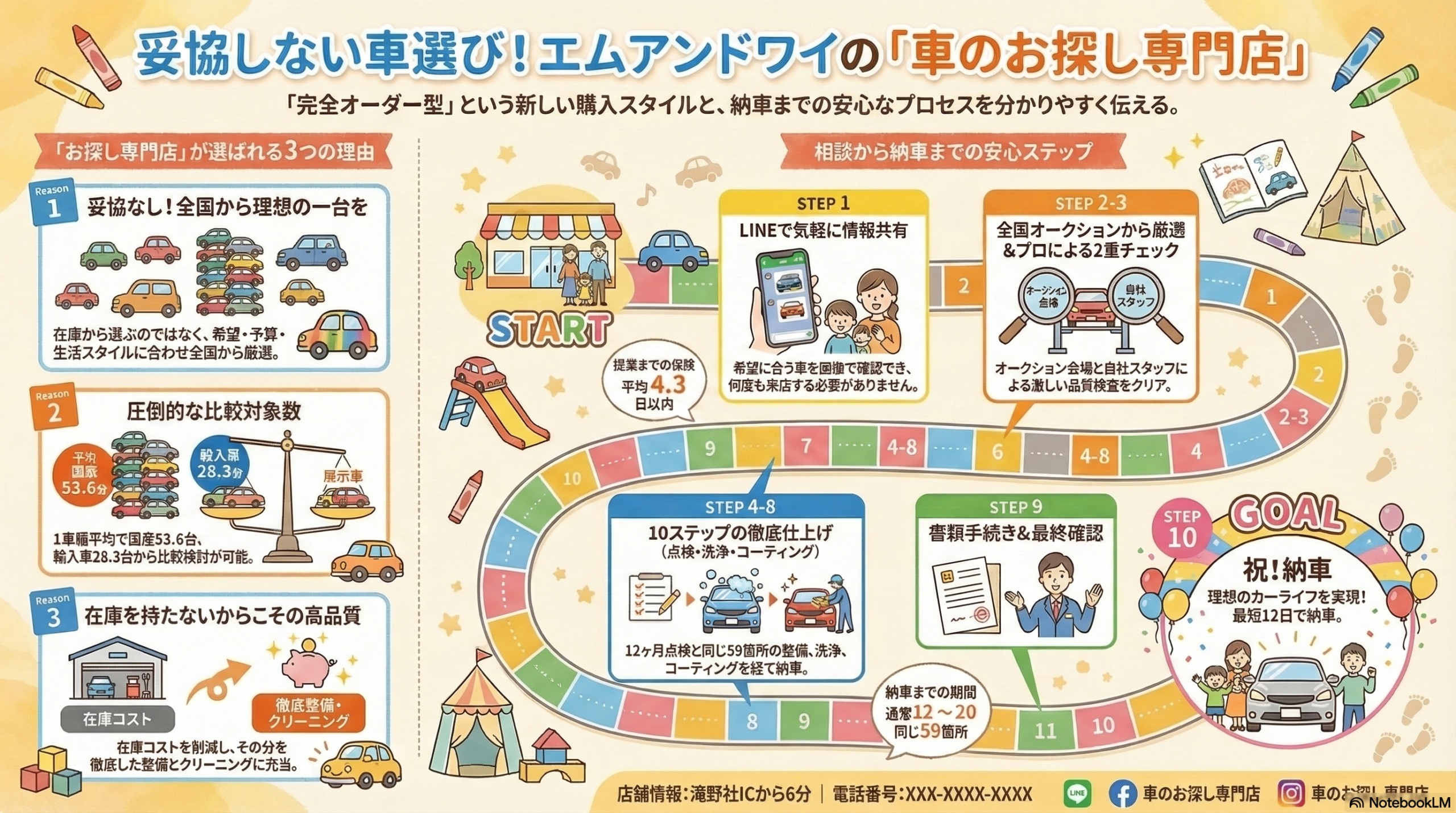 車のこと、どこから始めたらいいか分からないけれど、大切な自分・家族のために納得の車と暮らし実現したい方へ、いろんな車屋さんをまわる前の「最初の車屋」としてご利用いただいております。